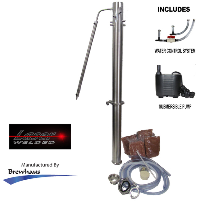 In the past, most of these designs used two cooling lines, one in the middle to lower portion of the column and another directly above it near the top of the column. The drawback to this design was that the lower cooling line affected mostly the higher boiling point fractions, such as water, which would not reach the upper portion of the column anyway. This lower cooling line was actually only of value in a system that was drastically overpowered and producing more vapor than the column could effectively control. However, this was changed a few years ago by Brewhaus America, when they raised the lower cooling line to be near the top of the column and subsequently began crossing the cooling lines in an “x” formation to increase the amount of vapor actually affected by the lines. They later increased the number of cooling lines in this formation to further improve efficiency. The result is that a very high portion of the rising vapor will either contact a cooling line or be affected by the cool temperature radiating from them. When this type of column is run properly, and the vapor does finally get past the cooling lines, it is usually of very high purity.