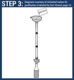 As the last drops of water pass through the funnel at the top of the filter, pour in your alcohol (Step 3). Taste the filtered water/alcohol so you know when only the straight alcohol starts to pass through and let it run into a collection container. To prevent the alcohol from vaporizing, you can cover the funnel with a lid.